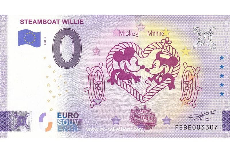 „STEAMBOAT WILLIE 0 eur“ označuje suvenýrní bankovky v hodnotě 0 eur s Mickey Mousem z filmu Steamboat Willie. Jedná se o sběratelské předměty, nikoli o skutečnou měnu, vydané různými organizacemi a dostupné od roku 2024. Prodávají se jako memorabilie, často v limitovaných číslovaných edicích, a kupují je sběratelé, kteří oceňují umění, nostalgii a status veřejné domény postavy po vypršení autorských práv.