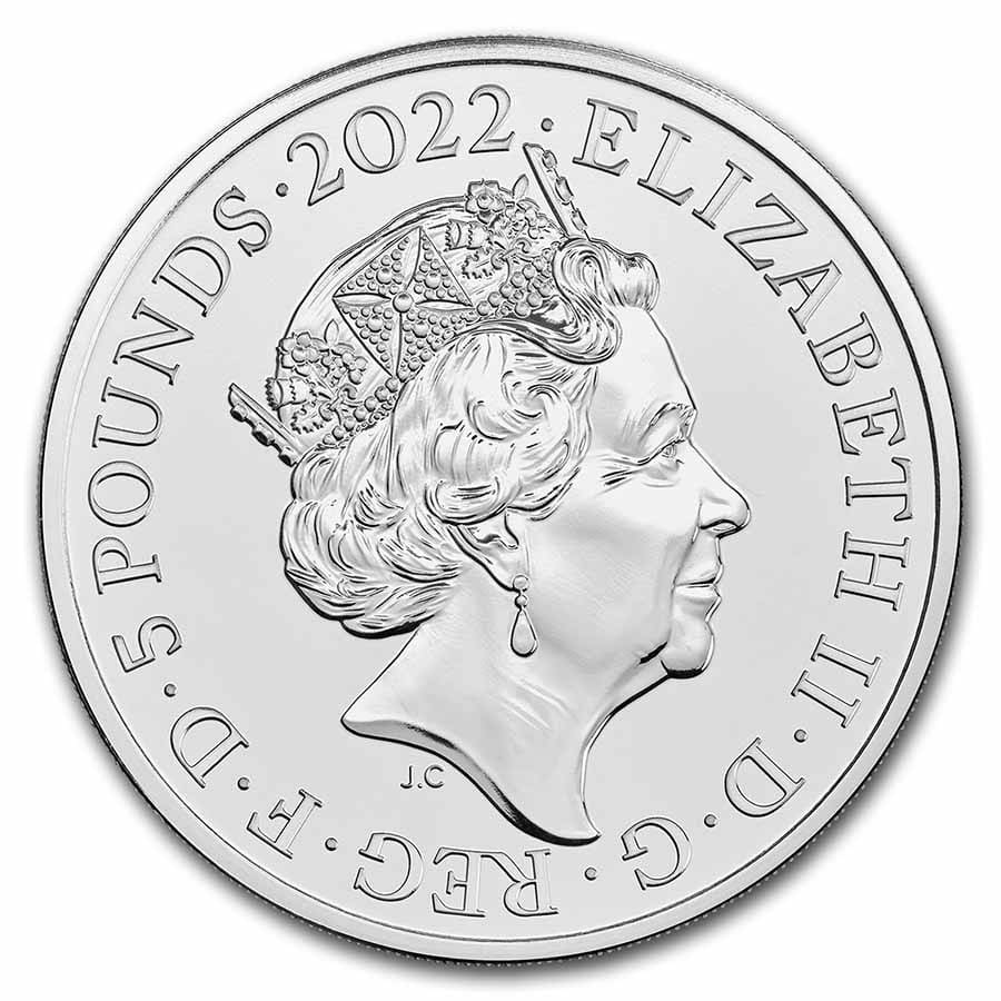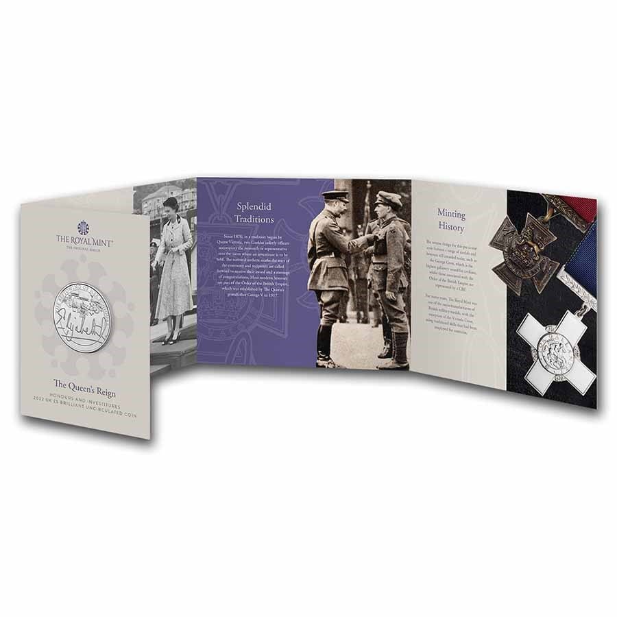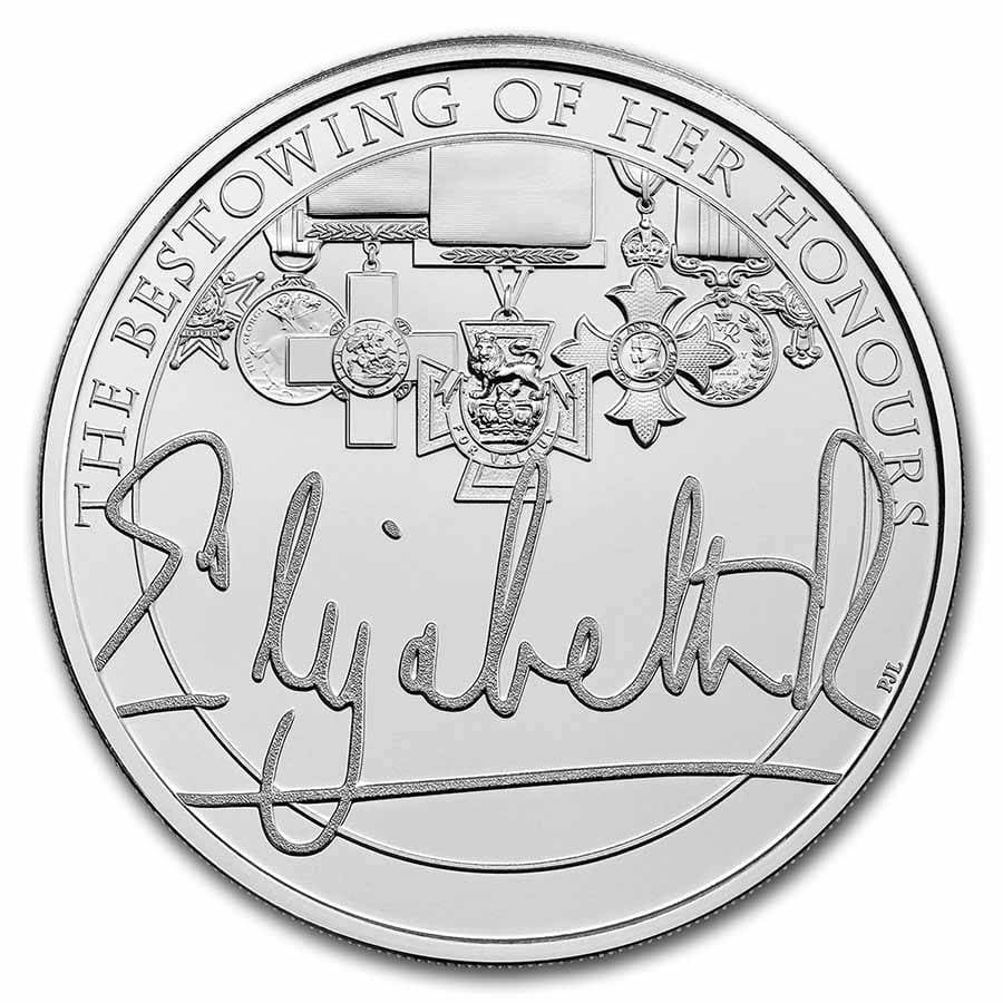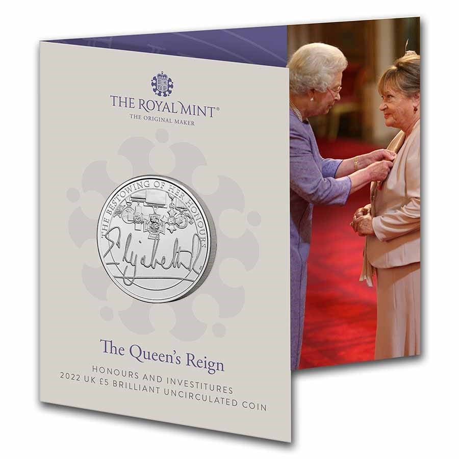 Tato 5librová mince Brilliant Uncirculated z roku 2022 byla vydána The Royal Mint u příležitosti platinového jubilea Alžběta II., které oslavovalo 70 let její vlády. První edice této série tří mincí vzdává hold vyznamenáním a oceněním, která královna uděluje za výjimečné zásluhy.
