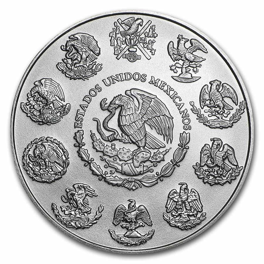 Avers: Obsahuje sochařský reliéfní design národního štítu, obklopený legendou „Estados Unidos Mexicanos“ (Spojené státy mexické), obklopený různými národními erby používanými v celé historii Mexika.