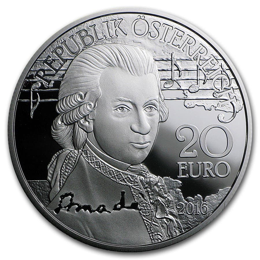 Líc: Portrét Mozarta v propracovaně vyšívaném saku s charakteristickou volánkovou košilí. Na pravém rameni je vyobrazeno jeho druhé jméno „Amade“. Zobrazeny jsou také nominální hodnota 20 €, země vydání a rok 2016.