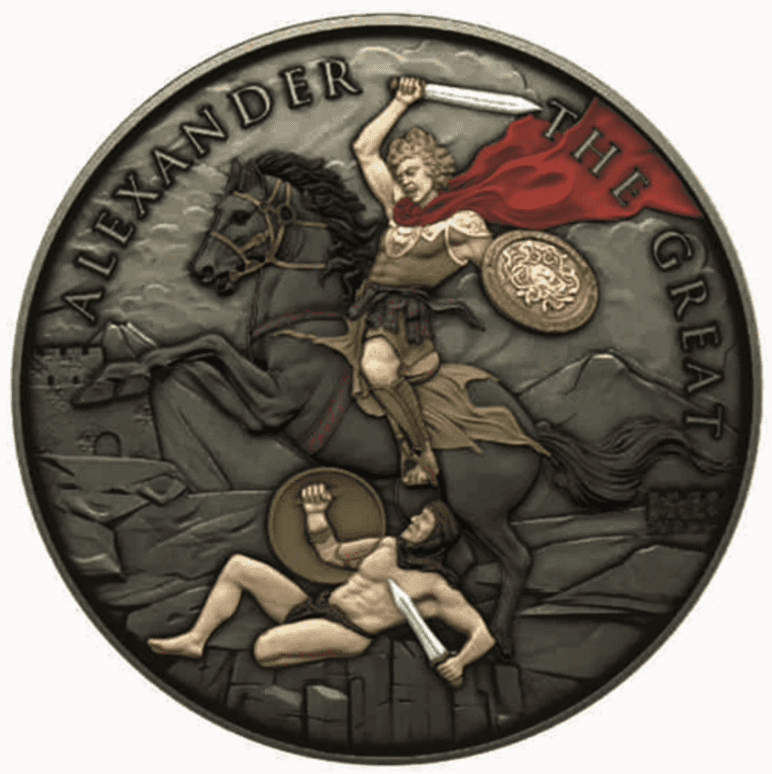 Představujeme stříbrnou minci Alexandr Veliký – Legendární bojovníci, čtvrtou minci ze série Legendary Warriors, vyrobenou z 1 trojské unce ryzího stříbra o ryzosti 99,9 %. Tento barevný sběratelský kousek s antickou povrchovou úpravou vzdává hold jednomu z největších stratégů a dobyvatelů historie, Alexandru Velikému, známému svým vítězstvím nad Perskou říší.