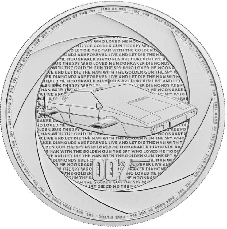 Představujeme stříbrnou minci James Bond 70. let 2024, druhý titul z edice Šest desetiletí agenta 007 od renomované Královské mincovny (The Royal Mint). Tento sběratelský kousek vzdává hold ikonickému období Bondových filmů 70. let, kdy Roger Moore přinesl agentu MI6 šarm a sofistikovanost, a zahrnuje motiv legendárního vozu Lotus Esprit S1 z filmu „Špión, který mě miloval“.