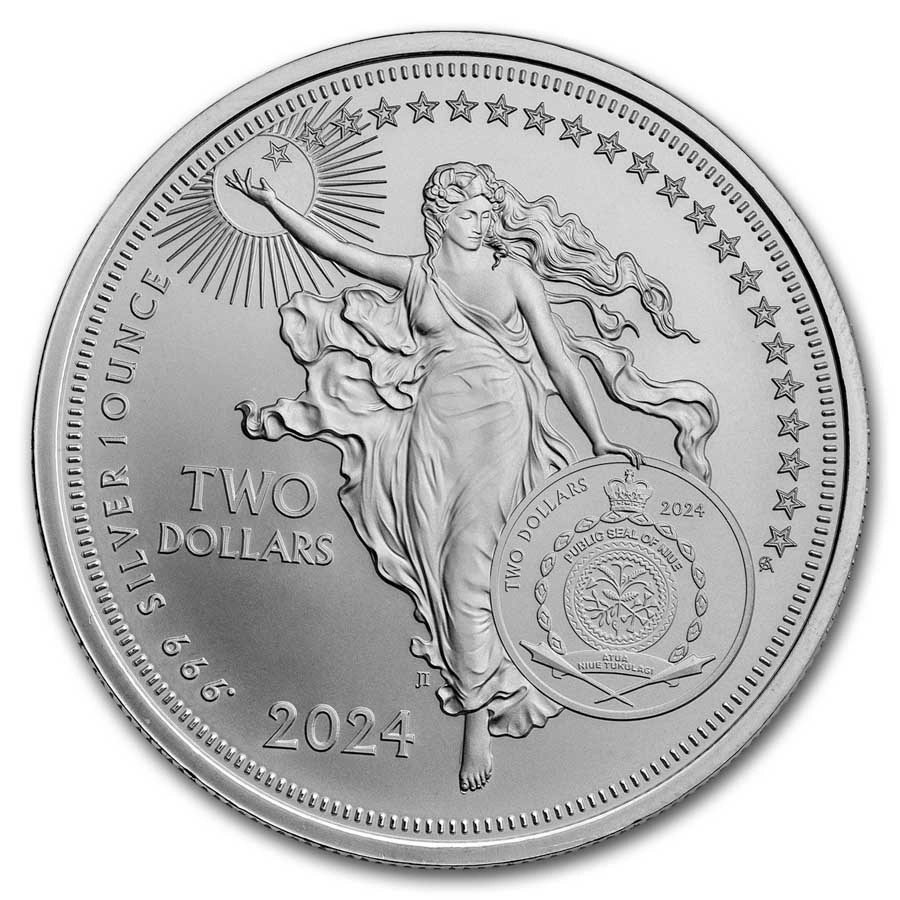 Rubová strana (Múza): Nese ikonický obraz série – triumfální múzu natahující se ke slunci, pečeť národa Niue, nominální hodnotu 2 NZD a rok ražby 2024.