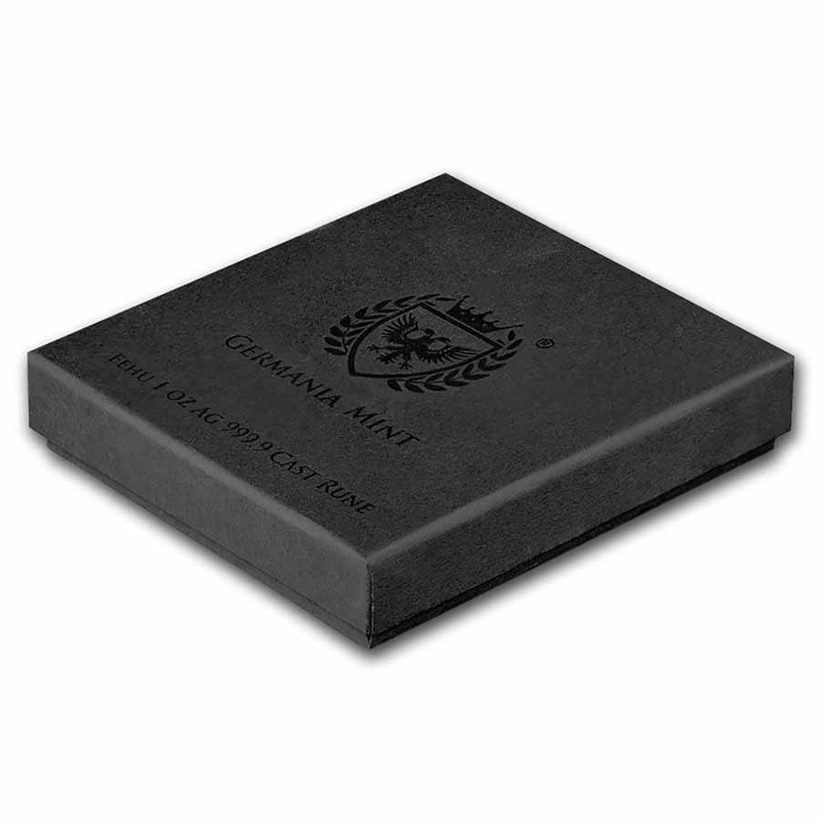 Germania Mint představuje tyto sběratelské runy, každou s jedinečným číslem z celkové ražby 2 500 na jednu runu odlitou v 1 oz jemného stříbra 0,9999. Použijte černé světlo, aby zářily jako plamen. Toto písmeno starověké německé runové abecedy je Algiz.