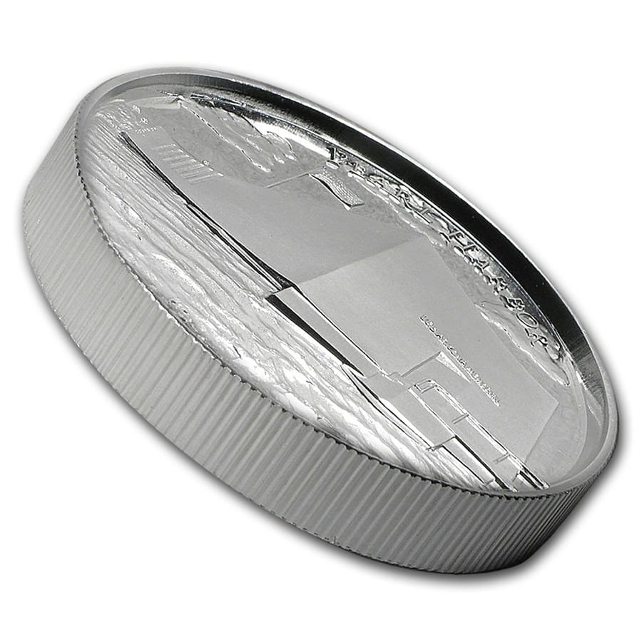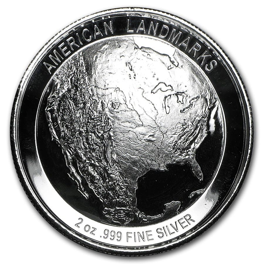 Revers: Ukazuje trojrozměrné, ultra vysoké reliéfní vykreslování země a obsahuje nápisy “AMERICAN LANDMARKS” a “2 oz .999 FINE SILVER”.